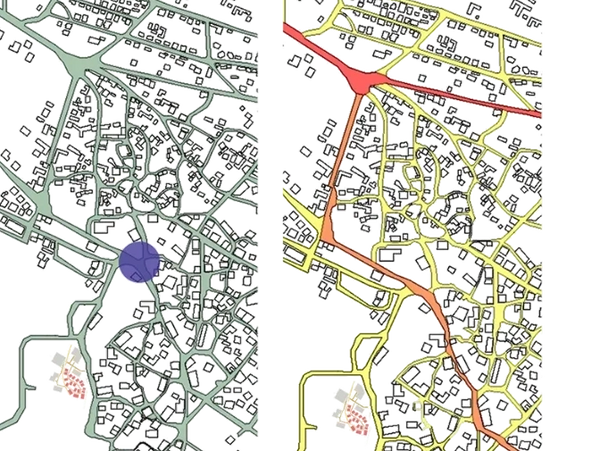 Köyün meydanı ile yollarının arazimiz için ilişkisini görebileceğimiz yol aksları analizini görüyoruz. Bu yolların köy içindeki yoğunluğu kırmızıdan sarıya doğru gösterilmiştir.